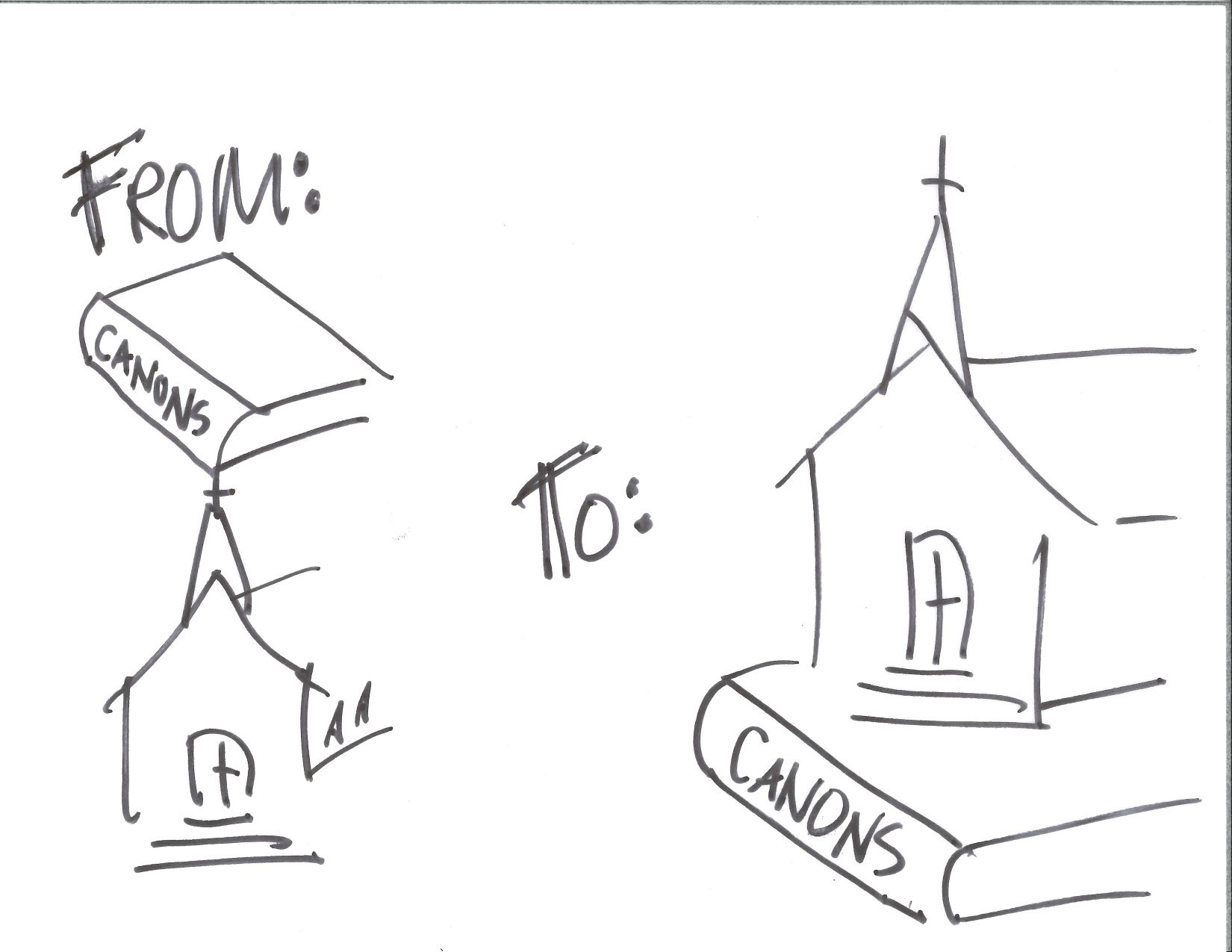 It also reminded me of a two panel cartoon drawn by our own Missioner, Tim Hodapp, who shared his creation at the most recent meeting of elected bodies. The first panel showed a drawing of a church building with the church canons and constitution crushing the roof. The second panel again showed a church building, but this time the church canons and constitution were underneath the building serving as part of the foundation.